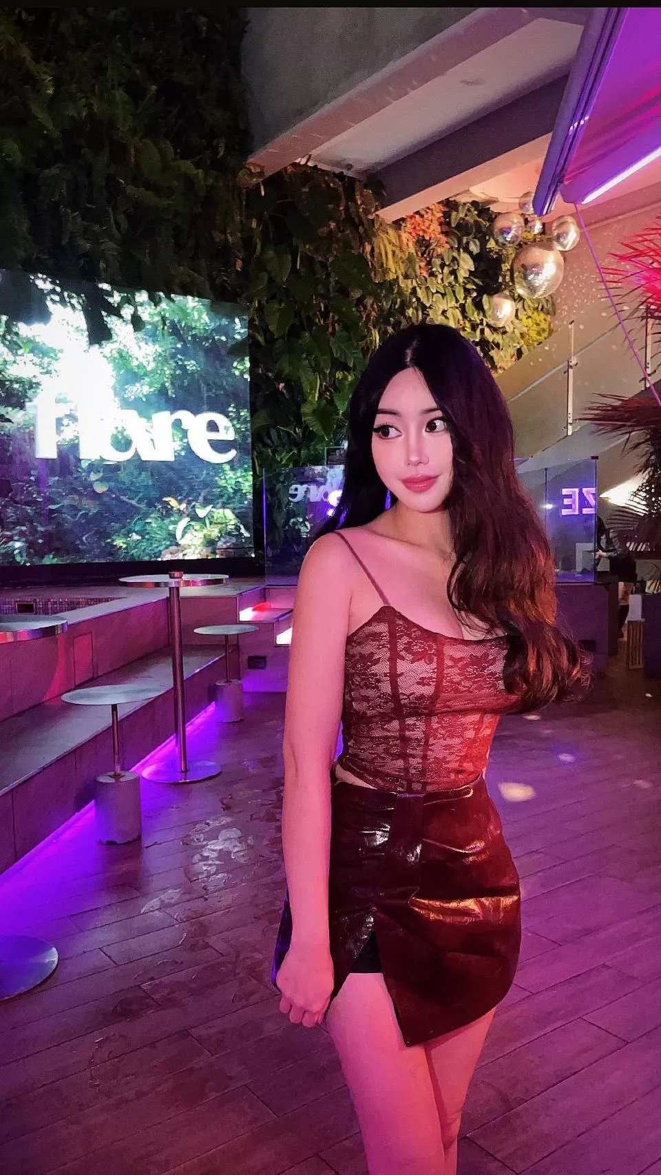 彈力內縫胸墊假透膚紅色蕾絲細肩帶上衣 × 紅色亮面開叉皮裙