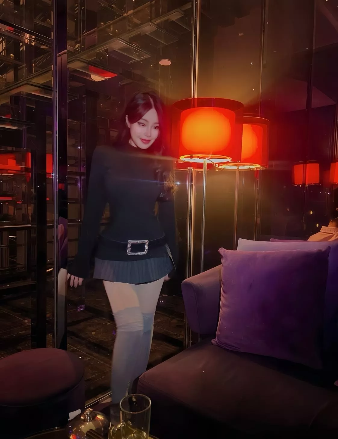 搭配超短裙+水鑽腰帶